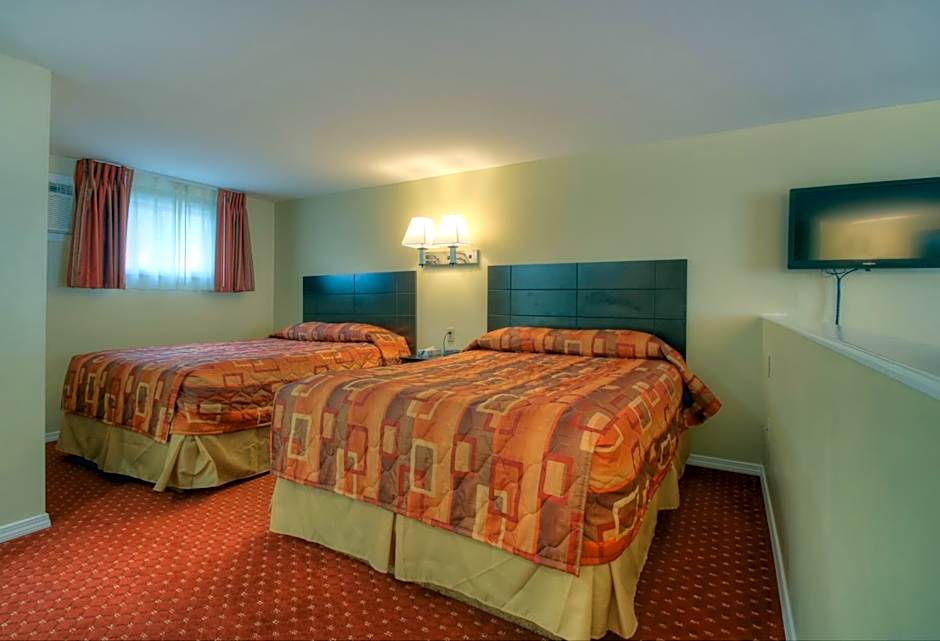 This two-bedroom apartment has 1 queen bed in each bedroom. It has a large living room, kitchen and a dining area. The kitchen is equipped with basic pots and pans, cutlery, plates and glasses. It also has an ironing board and an iron.